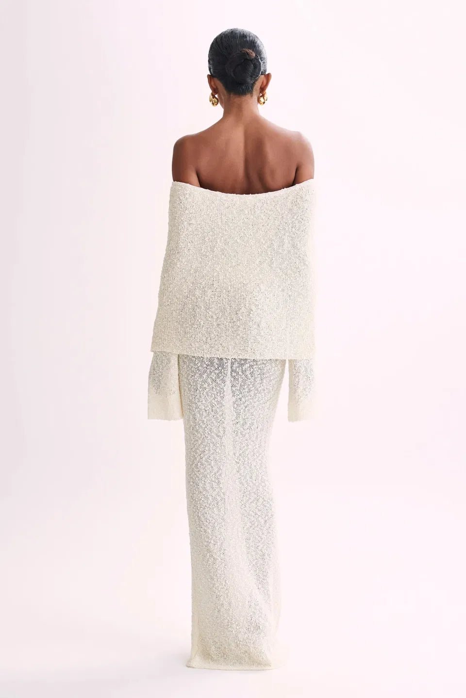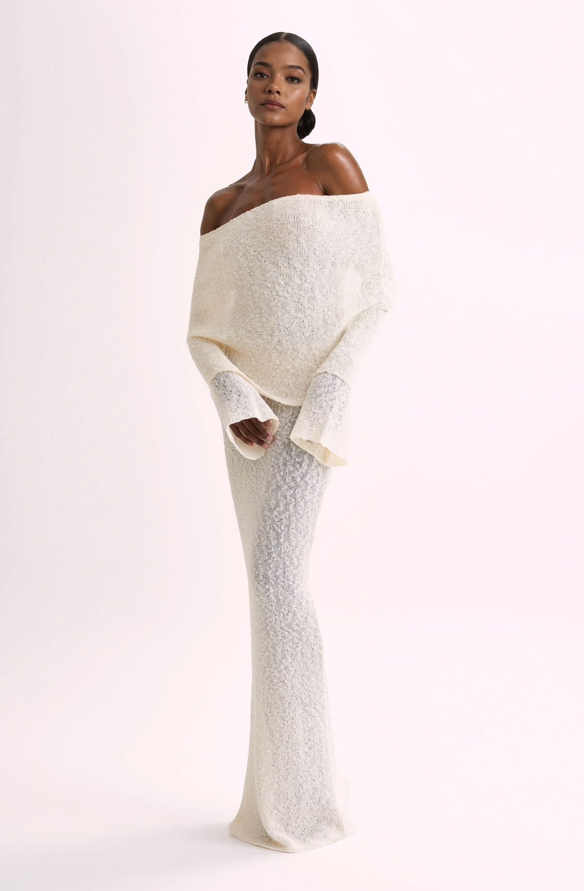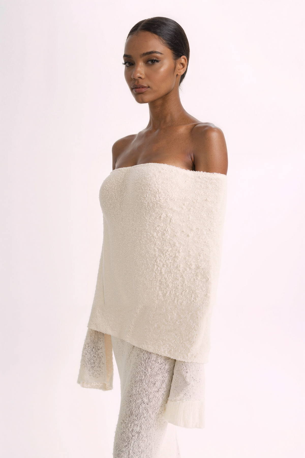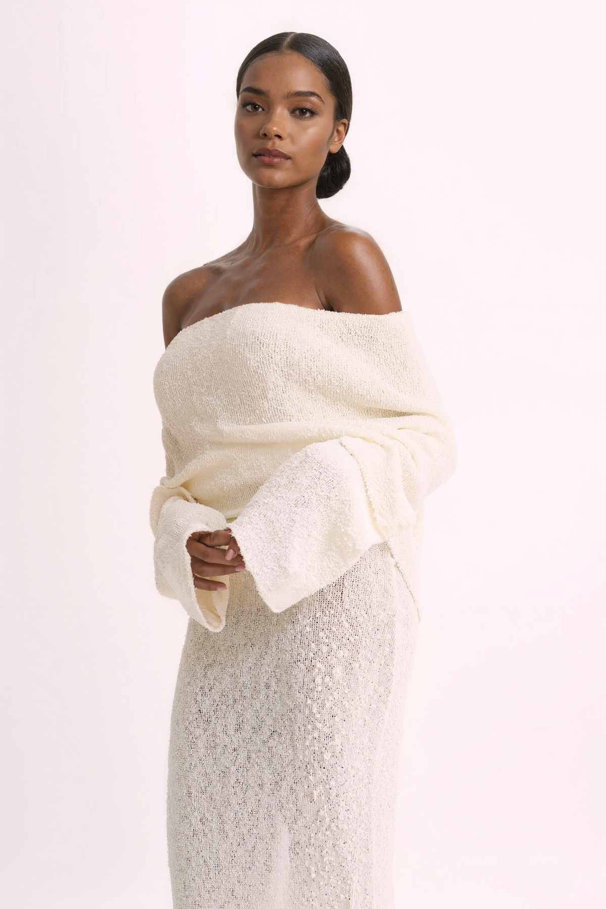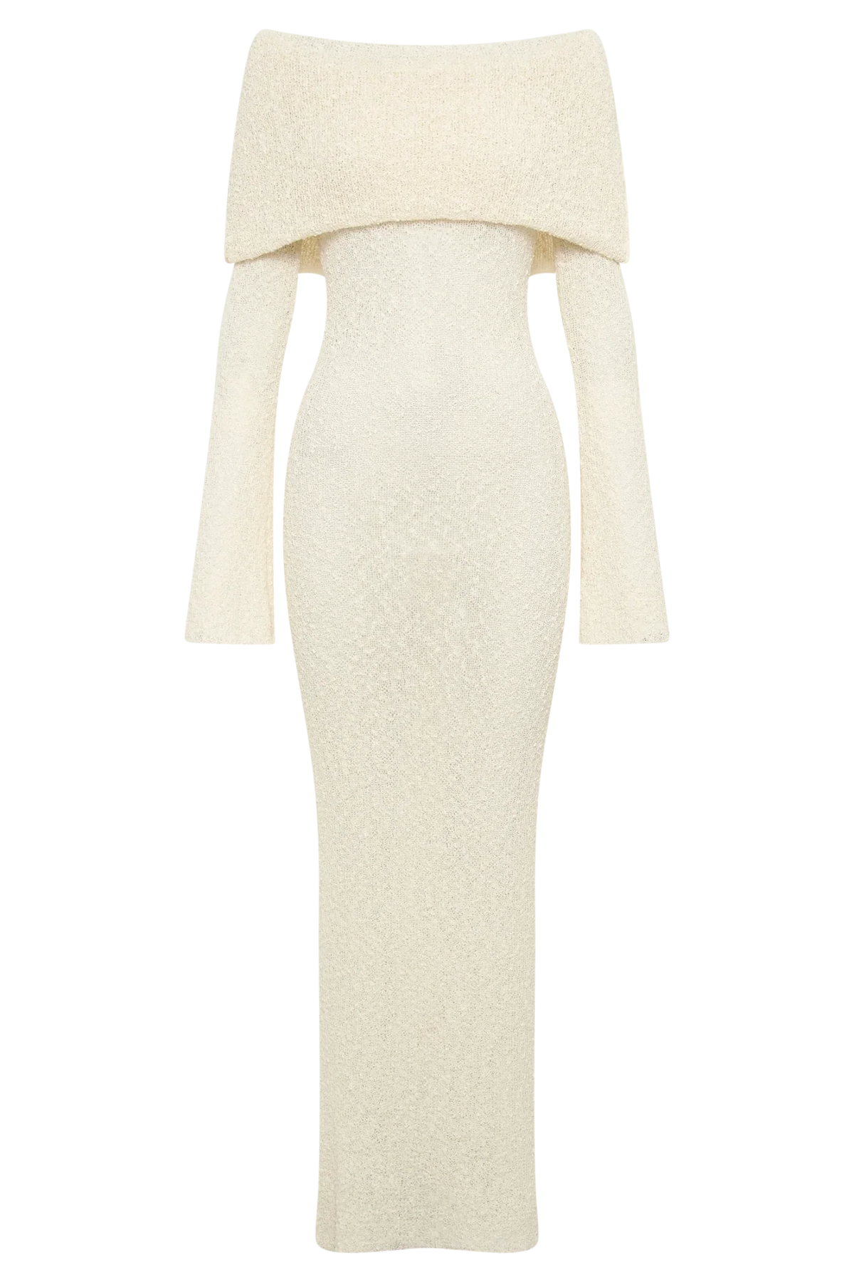 Experience the allure and modern aesthetic of MARI, the must-have ribbed boucle dress made of a fine cotton blend. Its figure-sculpting silhouette and unique drape-styled, off-shoulder neckline combined with flared long sleeves will make you stand out at any special occasion.