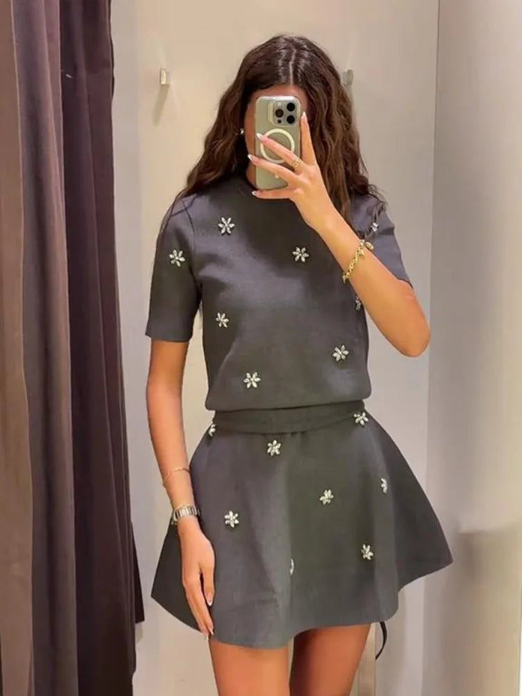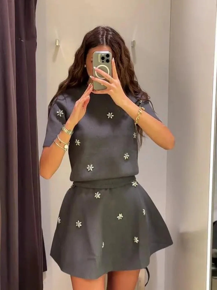 Elevate your wardrobe with the Kairi Charming Floral Set, a stunning ensemble that blends delicate beadwork with effortless style. This coordinated outfit features a chic round-neck top paired with an A-line skirt, perfect for creating a timeless look with a touch of glamour.